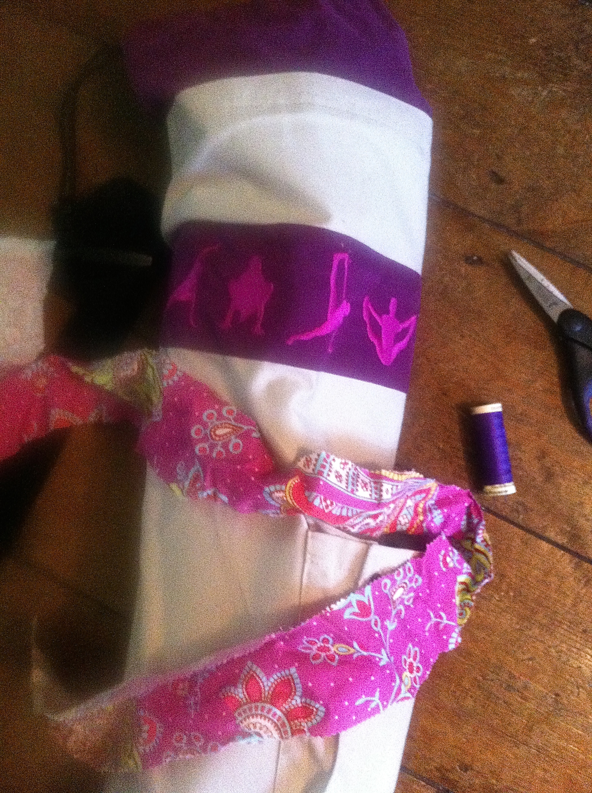 IMG_5621I’ve been going to yoga classes on and off for years: lunchtime in the former Labour Party HQ, lunchtime near the former offices of Time Inc, formerly IPC), evenings at Morley College (Brian, a great teacher, is also the proprietor of The Button Queen off Marylebone High Street), lunchtimes at Triyoga in Soho, naked on a Greek beach, and selected postures in the office along the way. Now I’m working from home, and currently going to local yoga and Pilates classes three times a week (and it feels so good!). This means that my trusty yoga mat bag has been in my line of sight more than before, and that means that the terrible embroidery of yoga postures – some are so inaccurate as to be anatomically unachievable – has been irritating me more than before. It needed to be covered up so I found a scrap of fabric and I’m hand-sewing it on, tucking in ends and sides as I go. It’ll be finished today, ready for Pilates tomorrow morning.