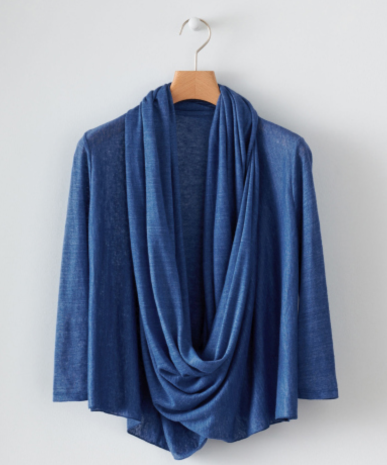 IMG_5620My previous experiences with dyeing haven’t been successful. This is because my approach to such matters can be somewhat slapdash. I can tell you from personal experience that what it says on the packet about suitable fabrics for dyeing is pretty accurate! However, I was given a garment from Poetry that I liked the shape of (a one-piece cardigan with a loop of fabric hanging in the front that you twist over your head to give a ruched crossover front and lapel effect. If it has a specific name, please let me know!), but didn’t like the peachy colour of. Happily, it was made of a jersey-effect woven linen. Linen being a natural fabric and therefore perfect for dyeing, I bought a packet of Dylon Navy Blue dye, and followed the instructions. I washed the top, left it wet, weighed out salt, mixed dye and salt, filled a bucket with water, added the dye, stirred and stirred and rinsed. It needed to dry out of direct sunlight so as it was dripping wet it ended up draped over the olive tree at the end of the garden. And I have a new addition to my wardrobe, looking like the one above, but darker blue.